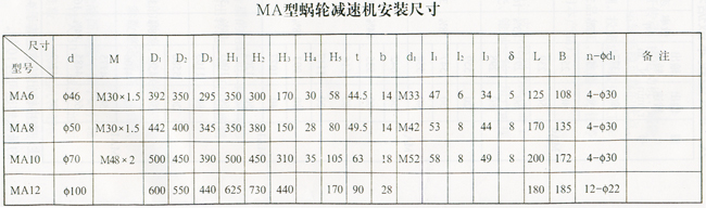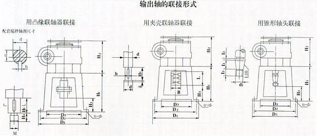注:该产品输出轴联接形式可根据需用,分别采用锥体、螺纹联接式、对开放联轴器、凸圆钢性联轴器等形式的联接,该安装形式和尺寸符合化工部94标准。