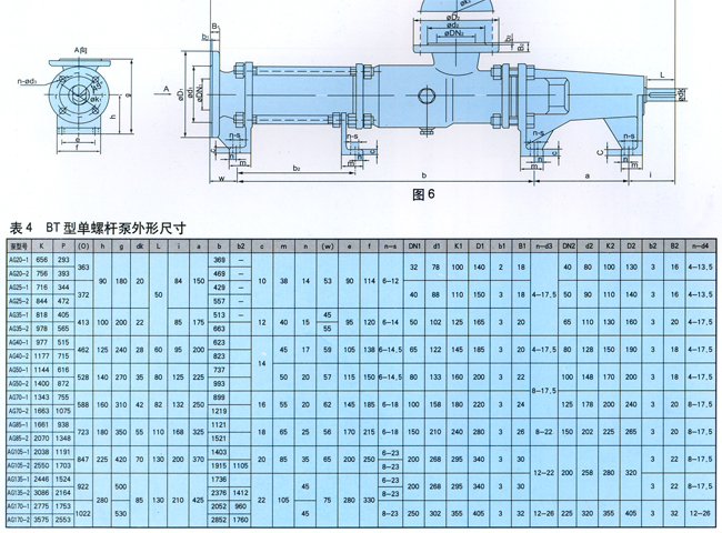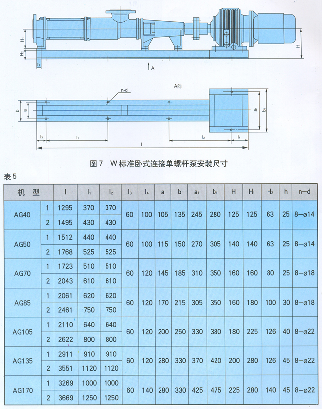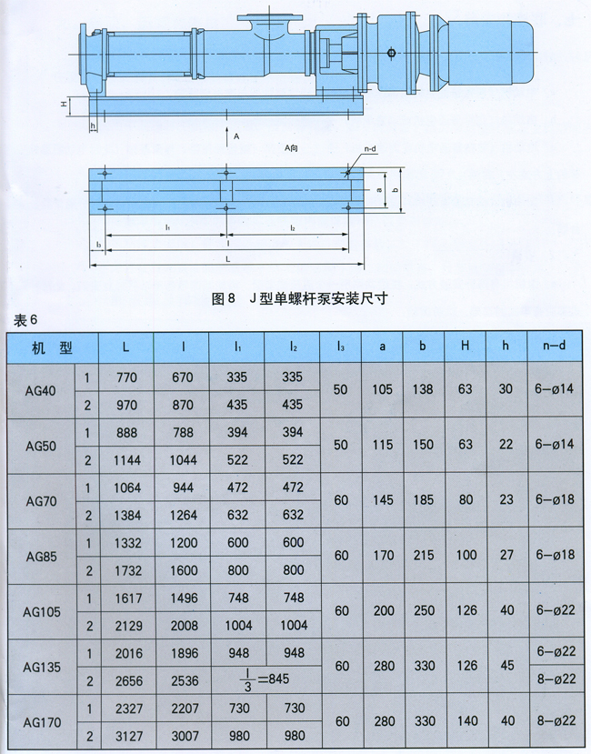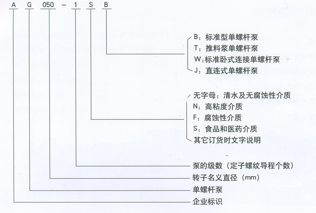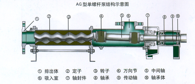 AG型单螺杆泵由吸入体、排出体、工作部分(转子和定子)传动部件、万向节部件、密封部件和轴承座组成。(见图1)