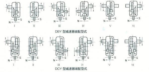 减速器按出轴形式可分为Ⅰ、Ⅱ、Ⅲ、Ⅳ、Ⅴ、Ⅵ六种装配型式,按旋转方向可分顺时针(S)和逆时针(N)两种方向,Ⅲ、Ⅳ、Ⅴ、Ⅵ型可装制动或逆制装置。如图。